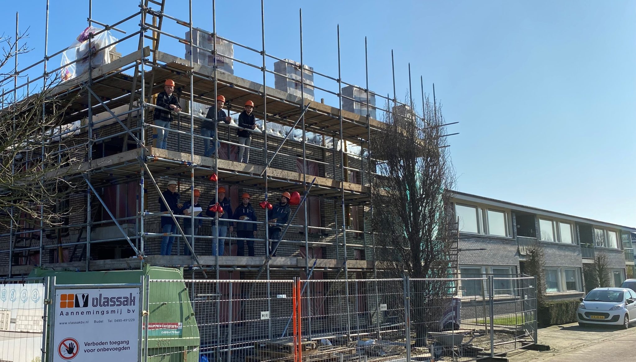 “Soms moet je even stilstaan bij een relatie”, geeft Marcel aan. “En als je daar blij mee bent, mag je best je waardering laten zien. De samenwerking met de Budelse aannemer Vlassak verloopt bij dit project zo goed, dat de woningen aan de nieuwe straat De Den nog deze zomer worden opgeleverd.” Terwijl de metselaars nog een worstenbroodje pakken, kijken directeur Jack Vlassak en zijn projectleider Theo Wijen toe. Ze staan voor zes levensloopbestendige appartementen en een lift die er straks voor gaat zorgen dat ook de bovenverdiepingen van de huidige woonblokken toegankelijker worden voor oudere of minder valide bewoners.