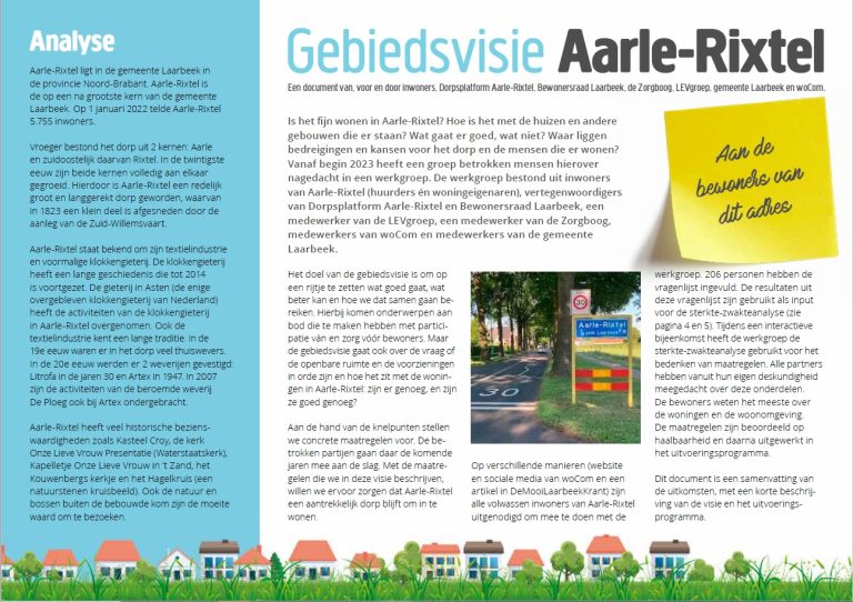 Aarle-Rixtel is een fijn dorp, maar er kunnen altijd dingen beter. Daarom heeft woCom een gebiedsvisie gemaakt. Samen met een betrokken groep inwoners van Aarle-Rixtel (huurders én woningeigenaren), Bewonersraad Laarbeek, dorpsplatform Aarle-Rixtel, de Zorgboog, LEVgroep en medewerkers van de gemeente Laarbeek.