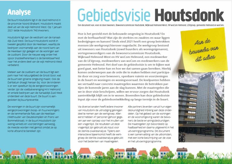 De gebiedsvisie voor Houtsdonk is klaar. WoCom heeft deze samen met betrokkenen opgesteld. Dit waren betrokken inwoners van Houtsdonk (huurders én woningeigenaren), vertegenwoordigers van de bewonerscommissie Houtsdonk, Wijkraad Helmond-West en HV woCom Helmond, en medewerkers van de LEVgroep, gemeente Helmond en woCom. Dat startte met een enquête. Hieruit kwamen sterke en zwakke punten naar voren en kansen en bedreigingen. Tijdens een interactieve bijeenkomst keek de werkgroep naar de problemen en hoe deze aangepakt kunnen worden. Hier zijn verschillende maatregelen voor bedacht en die worden vanaf nu al opgepakt.
