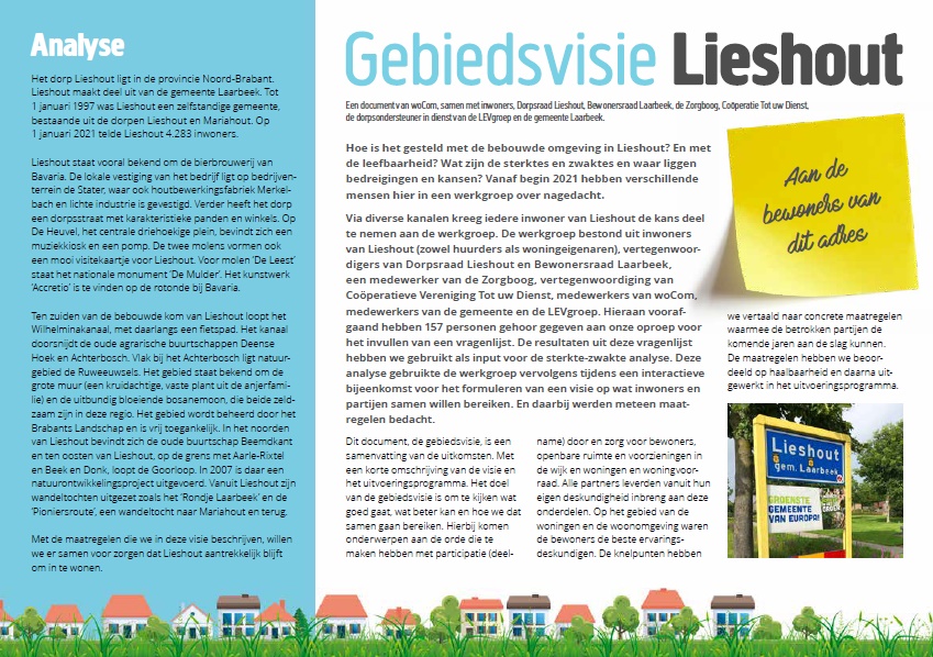 In 2021 werkte woCom, samen met Dorspraad Lieshout, Bewonersraad Laarbeek, de Zorgboog, Coƶperatie Tot uw Dienst, de dorpsondersteuner en de gemeente Laarbeek aan een gebiedsvisie voor Lieshout.