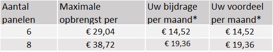 In de tabel hieronder ziet u een voorbeeldberekening van de kosten en de mogelijke besparing. De exacte energieopbrengst is afhankelijk van bijvoorbeeld de stand van de zon ten opzichte van het dak, het aantal zonne-uren en de aanwezigheid van bomen of een dakkapel.