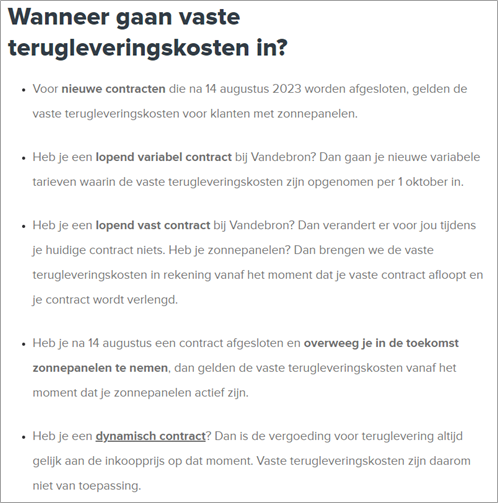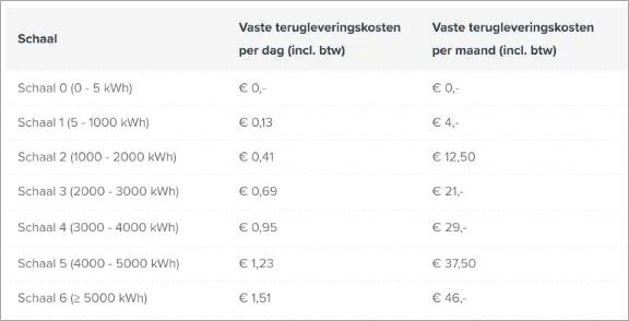 Voor klanten met lopende variabele contracten gelden de terugleverkosten vanaf 1 oktober. Deze kosten zijn afhankelijk van de hoeveelheid energie die wordt teruggeleverd aan het net. Teruglevering is de is de energie (in kWh) die u opwekt minus de energie die u direct in uw huis verbruikt. Hoe meer u terug levert (dus de hoeveelheid stroom die u terug levert op het net), hoe hoger uw vaste terugleveringskosten. Dit is ingedeeld in schalen, waarbij de kosten per schaal zijn vermeld op website van Vandebron. Hieronder staat een print screen van de website betreffende die schalen.