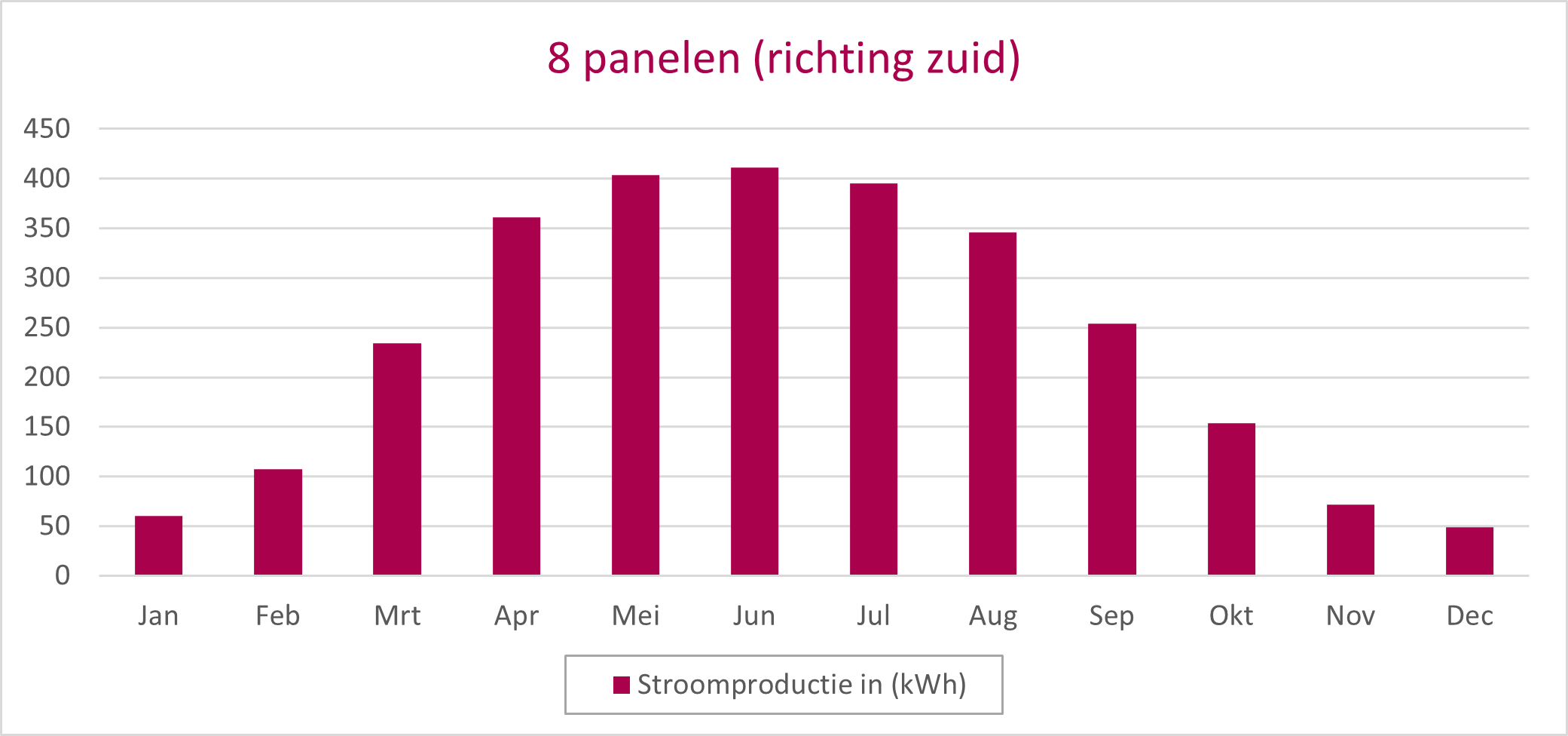 De bovenstaande grafiek is van een voorbeeld bij het dak richting het zuiden. De berekende opbrengst per maand is in de grafiek weergegeven. De jaaropbrengst in dit voorbeeld is 2850 kWh. Dat wil zeggen dat u met 8 panelen op het zuiden, niet boven schaal 3 komt.