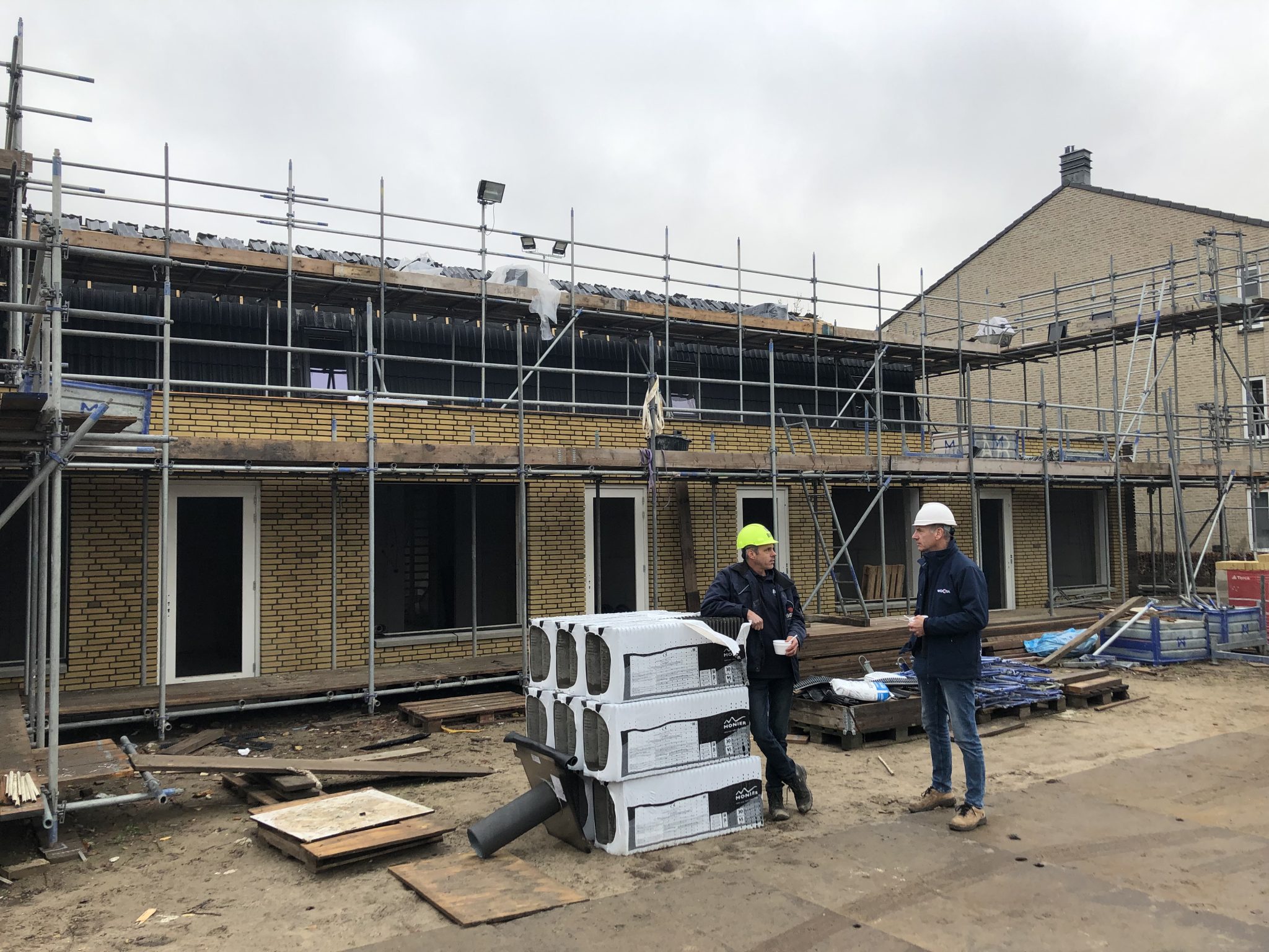 De nieuwbouw verloopt volgens planning. “Ondanks het snertweer is er hier niets in de soep gelopen,” lacht projectleider Marcel Stouten van woCom. “Voor ons reden om de bouwvakkers die in weer en wind het dak op gaan een warm bedankje te geven. Waar net nog de dakpannen van hand tot hand gingen, laten we nu de snertpan rondgaan. Van dakpan naar snertpan, zeg maar!”